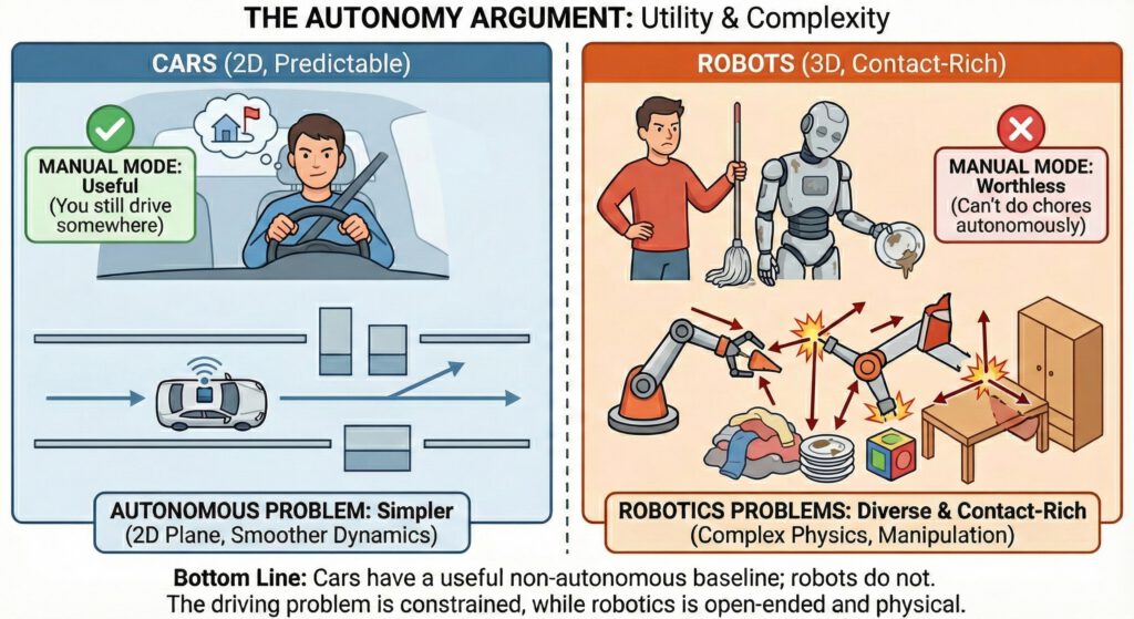 Yes, yes, I heard you. Cars are still useful even when not autonomous (because you still can drive somewhere); robots are worthless if they can’t do chores autonomously; autonomous driving is dealing with a simpler problem on a 2D plane whereas robotics problems are more diverse and contact-rich. As Nano Banana puts it: